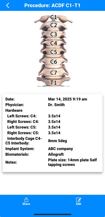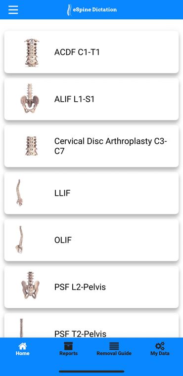 The eSpine Dictation app eliminates the need for paper dictation by electronically recording implant details for both users and end users. It also features a unique removal guide database that specifies the required screwdrivers for spine implant removal, offering a reliable resource to enhance customer support.